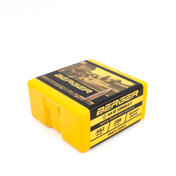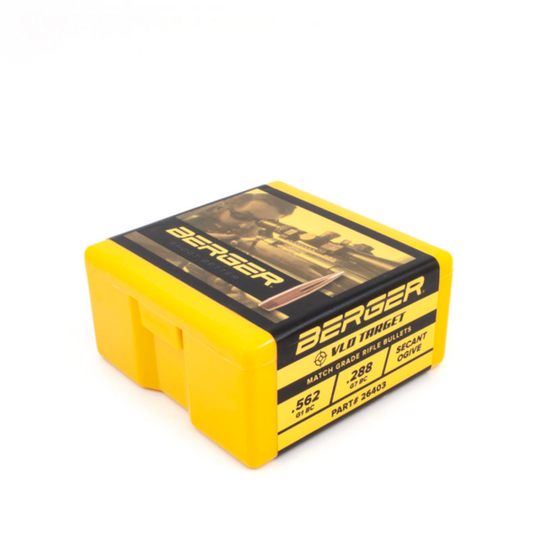 The Berger VLD Target Rifle Bullet is one of the flattest shooting Rifle Bullets on the market today. Emulated by all others, the VLD Target Rifle Bullet incoporates a secant ogive design which allows the Rifle Bullet to experience less drag as it travels to the target. This reduced drag is why the VLD shoots flatter, experiences less wind-drift, and has a higher retained velocity than all others. A favorite load technique for the VLD’s is touching the rifling for single-shot applications, although some rifles may prefer as much as .150″ from the rifling. Berger VLD Target Rifle Bullets are extremely popular for competitive long range applications. Built with highly consistent J4 Precision Rifle Bullet jacket, most favored by custom Rifle Bullet makers.
